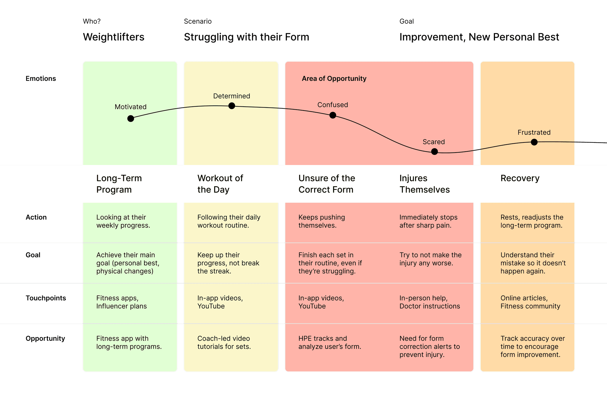 Through my interviews, I determined two types of users with unique challenges but the same root of the problem. Whether you're trying to do an exercise for the first time or perfecting your technique, the lack of personal guidance holds you back.